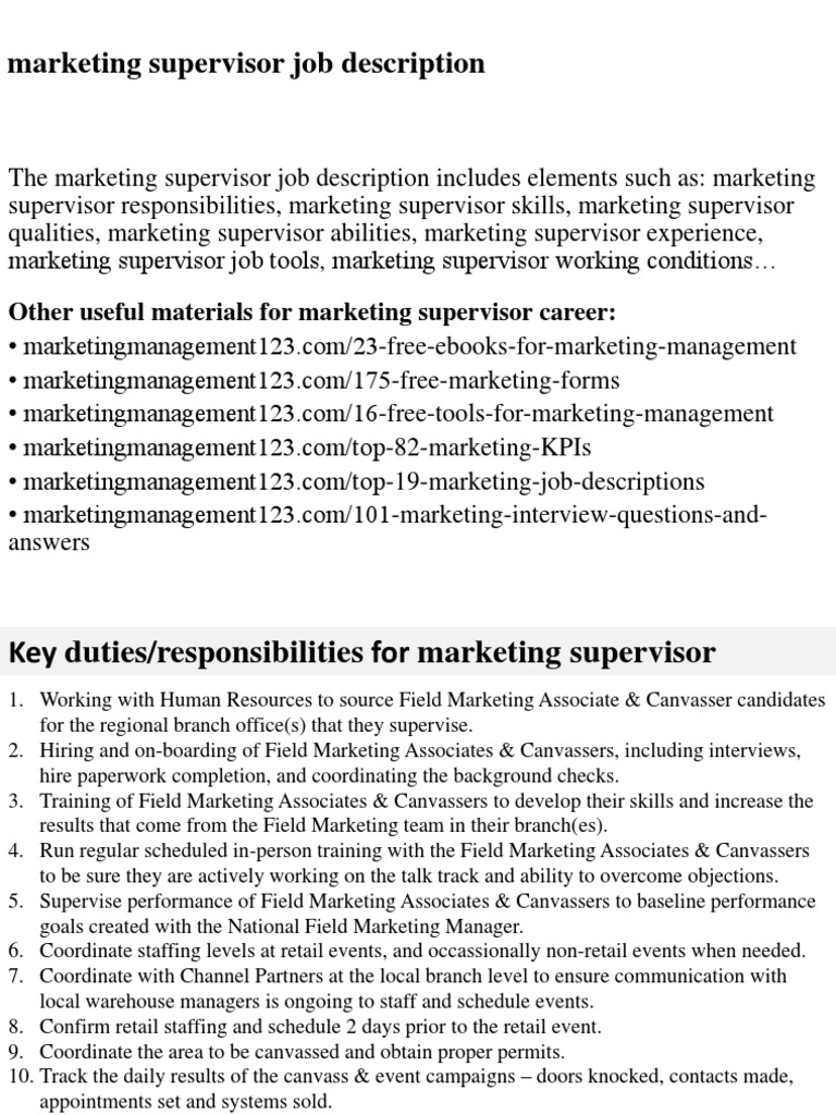 Supervisor marketing merupakan supervisor yang bertugas mengontrol dan memonitoring anak buahnya dalam bidang penjualan.